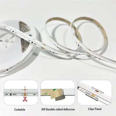 COB strips often feature 480leds/m ,576/leds,720leds/m and more t. Higher density means a smoother lighting